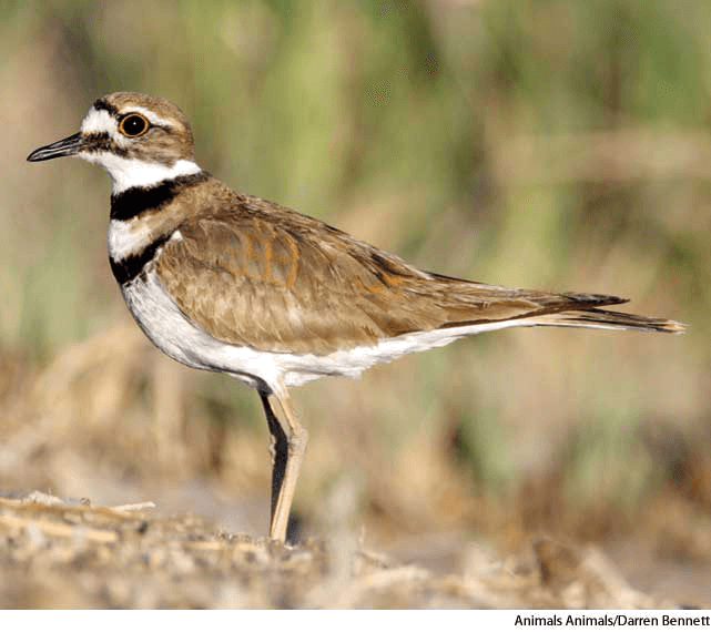 1. A New World plover(Charadrius vociferus) that has a distinctive noisy cry and two black bands across its breast. 双领鸻:一种西半球的鸻(双领鸻) 有独特的吵闹的叫声,在它的胸部有两道黑纹