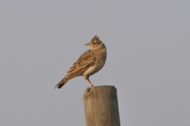 A sky lark perches on a pole.