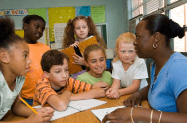 A teacher helps her students to learn.