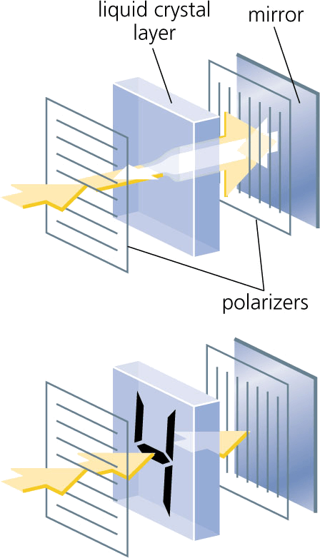 liq·uid-crys·tal display AHD[lĭkʹwĭd-krĭsʹtəl] D.J.[ˈlɪkwɪdˈkrɪstəl]K.K.[ˈlɪkwɪdˈkrɪstəl]n.(名词)abbr. LCD【缩写】 top: When turned off, polarized light reflects off a mirror, passes through the liquid crystal layer, and leaves the display looking white.bottom: When turned on, polarized light is blocked by the rear polarizer. Without the reflection of light, affected areas of the liquid crystal layer look black.Precision Graphics- An alphanumeric display on calculators and digital watches, made up of a liquid sandwiched between layers of glass or plastic, that becomes opaque when an electric current is passed through it. The contrast between the opaque and transparent areas forms visible characters.液晶显示:计算器中数字表上字母数字的显示,由夹在玻璃层和塑料层中间的液体构成。当电流通过时液体失去透明性,阴暗处和透明处的反差便形成了可见的字母
