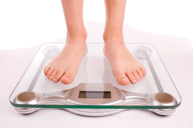 A woman steps on the scale to ascertain her weight.