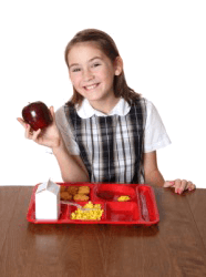 A girl eats her school lunch.