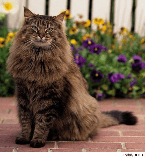 A large long-haired cat of a breed native to North America, having a bushy tapered tail and often a full ruff.