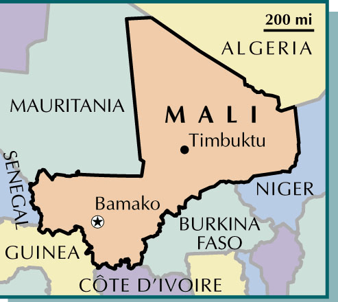 Ma·li AHD[mäʹlē] D.J.[ˈmɑːliː]K.K.[ˈmɑli]NONE(无词性) - A country of western Africa. A powerful empire from the 14th to the 16th century, Mali became part of French West Africa in the late 19th century and achieved independence in 1960. Bamako is the capital and the largest city. Population, 6,982,000.马里:非洲西部的一个国家。14至16世纪,马里曾是一个强大的帝国;到了19世纪晚期,它变成了法国西非殖民地的一部分,1960年取得独立。巴马科是其首都和最大的城市。人口6,982,000