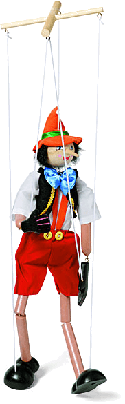 1. A jointed puppet manipulated from above by strings or wires attached to its limbs.牵线木偶:关节可以活动的木偶,通过系在其四肢上的线绳从上方来操纵它