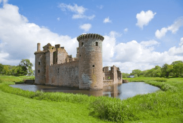 A small castle surrounded by a moat.