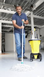 A man uses a mop.