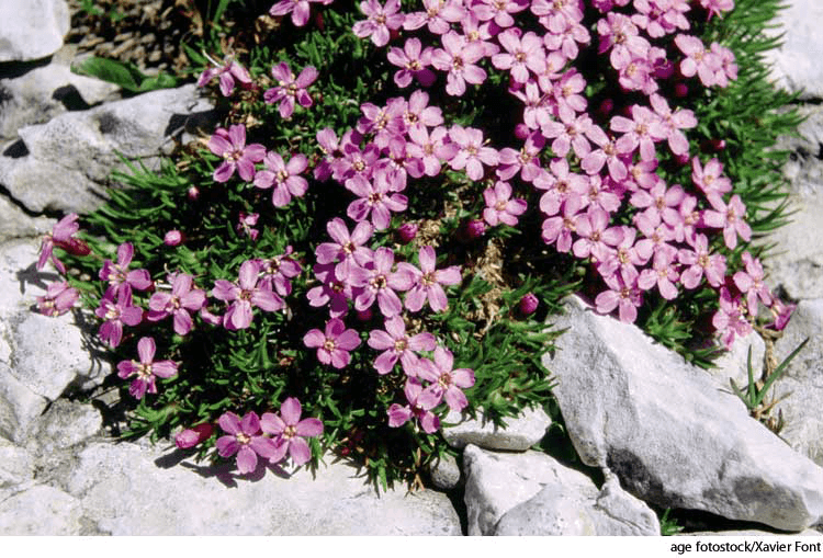 蝇子草属) ,开有紫红色花朵,并形成密集座垫状的一簇