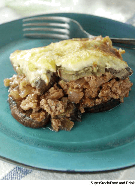 1. A Greek dish consisting of layers of ground lamb or beef and sliced eggplant topped with a cheese sauce and baked.肉末烤茄片:一道希腊菜肴,一层碎羊肉或牛肉加茄子片并在其上加干酪酱并烘烤而成