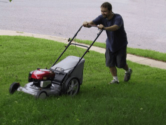 A man mows his yard.