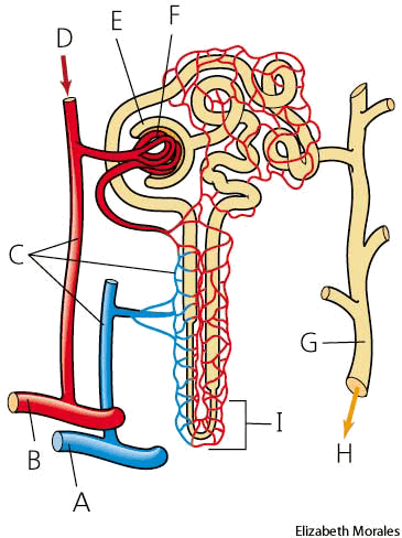 neph·ron AHD[nĕfʹrŏn] D.J.[ˈnefrɒn]K.K.[ˈnɛfrɑn]n.(名词) nephronA. renal veinB. renal arteryC. blood vesselsD. bloodE. Bowman's capsuleF. glomerulusG. collecting ductH. urineI. loop of Henle- Any of the numerous filtering units of the vertebrate kidney that remove waste matter from the blood.肾单位:脊椎动物肾内能将废物从血液中清除的无数个能起过滤作用的单位的任何一个