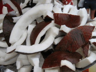 The white nutmeat of a coconut.