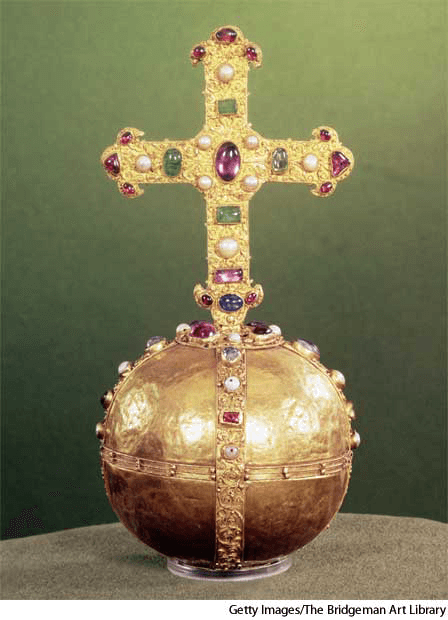 - A globe surmounted by a cross, used as a symbol of monarchial power and justice.权球:顶上装有一个十字架并象征着群权和公正的球