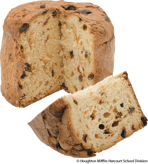1. A festive Italian yeast cake flavored with candied fruit peels and raisins.节日果子面包:意大利节日果子面包,配有水果干和果皮蜜饯