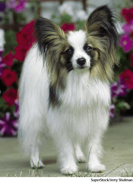 1. Any of a breed of small dog related to the spaniel, having a long silky coat, a bushy tail that curves over its back, and large ears shaped like the wings of a butterfly.蝶耳长毛狗:与獚相关的几种小狗,长有很长的丝般的毛、弯过背部的粗而多毛的尾巴和像蝴蝶翅膀似的大耳朵