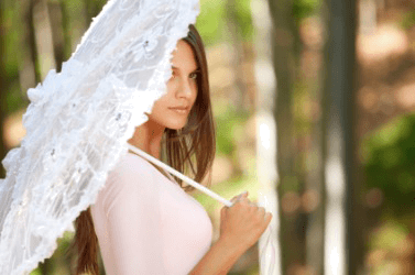 A woman poses with a lacey parasol.