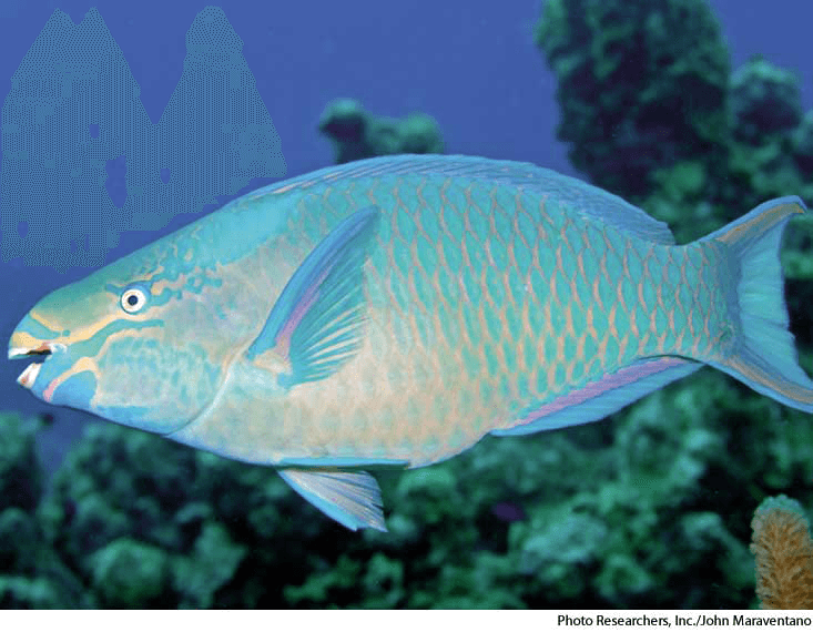 par·rot·fish AHD[părʹət-fĭsh'] D.J.[ˈpærətˌfɪʃ]K.K.[ˈpærətˌfɪʃ]n.(名词)【复数】 parrotfish 或 par.rot.fish.es  parrotfishqueen parrotfishScarus vetula- Any of various brightly colored tropical marine fishes, especially of the family Scaridae, having fused teeth resembling a parrot's beak.鹦嘴鱼:多中亮色的热带海鱼中的任一种,尤指鹦嘴鱼科的鱼,长有类似鹦鹉喙的牙齿