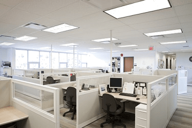 The office space has been partitioned into semi private cubicles.