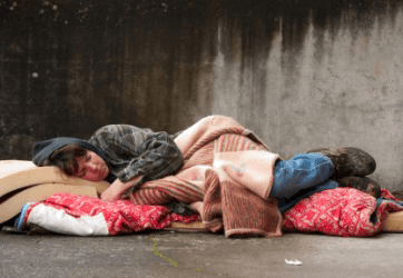 A pauper sleeps on the street.