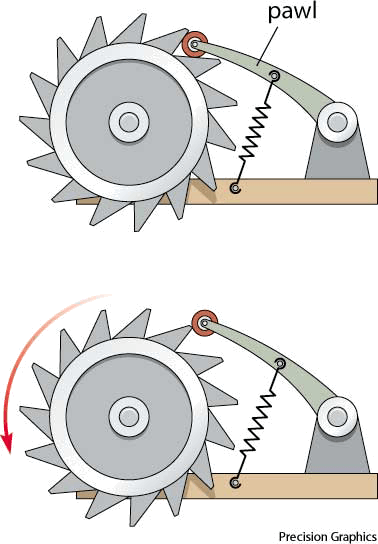 pawl AHD[pôl] D.J.[pɔːl]K.K.[pɔl]n.(名词) pawl- A hinged or pivoted device adapted to fit into a notch of a ratchet wheel to impart forward motion or prevent backward motion.掣爪,棘爪:一种枢轴或转轴器械,能与齿轮缺口或齿间吻合来前进或防止后移
