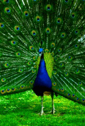 A peacock diplays his feathers.