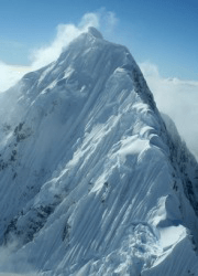 A snow covered mountain peak.