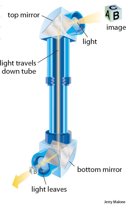 per·i·scope AHD[pĕrʹĭ-skōp'] D.J.[ˈperɪˌskəʊp]K.K.[ˈpɛrɪˌskop]n.(名词) periscopeLight enters the top lens of a periscope, reflects off a mirror set at a 45 degree angle, travels down the periscope tube, and reflects off a second mirror, also set at a 45 degree angle. Light that reflects off the second mirror exits through the bottom lens and into the eye of the user.- Any of various tubular optical instruments that contain reflecting elements, such as mirrors and prisms, to permit observation from a position displaced from a direct line of sight.潜望镜:一种管状镜,包含折射物,如镜子和棱镜,用以观察与视线不在同一直线上的位置