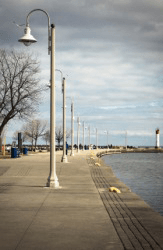 These streetlights are perpendicular to the walkway.