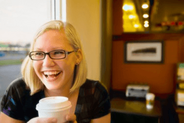 A young lady getting a pick me up from a cup of coffee.