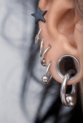 Multiple piercings in an ear.