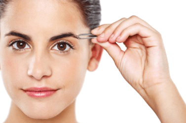 A woman uses tweezers to pluck her eyebrows.