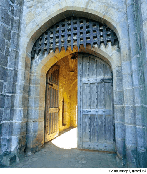 port·cul·lis AHD[pôrt-kŭlʹĭs, pōrt-] D.J.[pɔːtˈkʌlɪs, pəʊrt-]K.K.[pɔrtˈkʌlɪs, port-]n.(名词) portcullisBodiam CastleEast Sussex, England- A grating of iron or wooden bars or slats, suspended in the gateway of a fortified place and lowered to block passage.格子吊闸:由铁条、木条或其板条组成的闸门,悬于一城堡的入口处,可降下而堵住入口通道