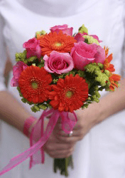 A bride holding a posy.