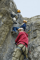 A family climbing a precipitous cliff.