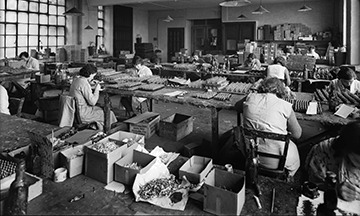 Women working in a preindustrial toy soldier factory in the 1930's.