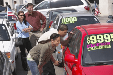 A family checking the price of a used car.