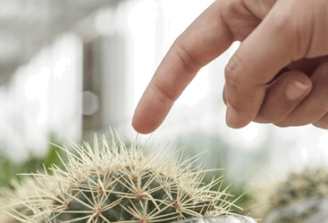 A woman about to prick her finger on a cactus.
