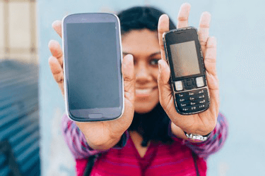 A woman shows the progress of an old cell phone versus a new smart phone.
