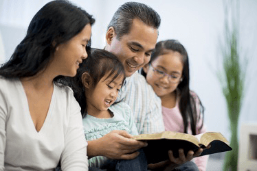 The parents promulgate the lessons in the Bible to their children by reading together.
