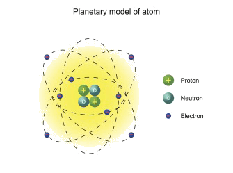A labeled diagram of an atom in which the protons are the green circles with the plus sign.