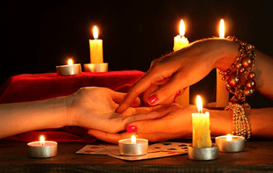 A woman getting a palm reading by a psychic.