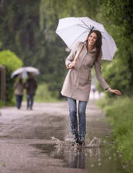A woman walking in a puddle on a rainy day.