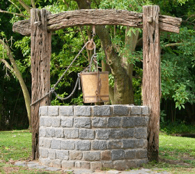 The pulley raises and lowers the well bucket.