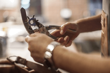 The craftsman uses a punch to put holes in a leather belt.