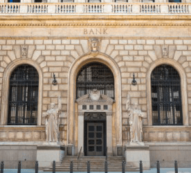 The front of a classic style bank building.