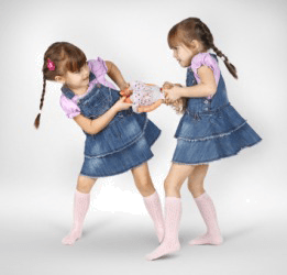 Two little girls quarrel over a doll.