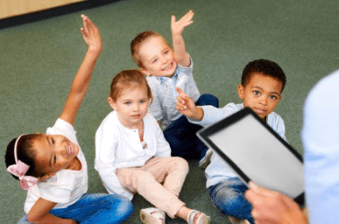 Children raise their hands to ask a question.