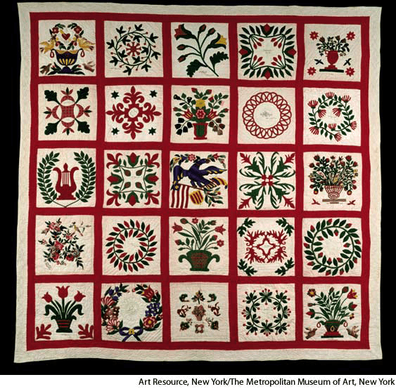 quilt AHD[kwĭlt] D.J.[kwɪlt]K.K.[kwɪlt]n.(名词) quiltc. 1846-1875 American appliquéd quilt- A coverlet or blanket made of two layers of fabric with a layer of cotton, wool, feathers, or down in between, all stitched firmly together, usually in a decorative crisscross design.被褥:由两层织物与中间的一层棉花、羊毛、羽毛或绒羽制成的床罩或毯子,通常以一种装饰性的十字压针脚紧密地缝合在一起