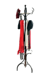 Scarves and hats on a rack.