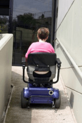 A woman using a wheelchair ramp.